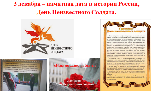 Памятный день в честь Неизвестного Солдата начали отмечать совсем недавно, с 2014 года. Российского государства организуют памятные мероприятия. В этот день страна чтит память павших защитников Родины, погибших в поле боя.. В классах прошли уроки мужества и классные часы «Разговор о подвиге и о бессмертии», «От неизвестных и до знаменитых..», «Имя твое неизвестно…» и т.д ЗДВР совместно с библиотекарем школы в провели час памяти «Помним тебя, неизвестный солдат», рассказали о бессмертном подвиге советских людей и о тех, кто не вернулся с войны, ценой своей жизни защищая своё Отечество. Ребята познакомились с историей праздника, воинской доблестью и подвигами, погибших российских и советских солдат, чьи имена остались неизвестными. В знак памяти о погибших воинах звучали строки. Также в ходе мероприятия ребята узнали о памятниках героям и мемориалах, посвящённых подвигу солдат и офицеров в Великой Отечественной войне. Учащиеся почтили память всех неизвестных солдат, защищавших Отечество, которые ценой своей жизни сберегли Родину, и выразили благодарность и уважение к воинской доблести и славе. В мероприятиях приняли участие 459 учащихся, 47 педагогов.