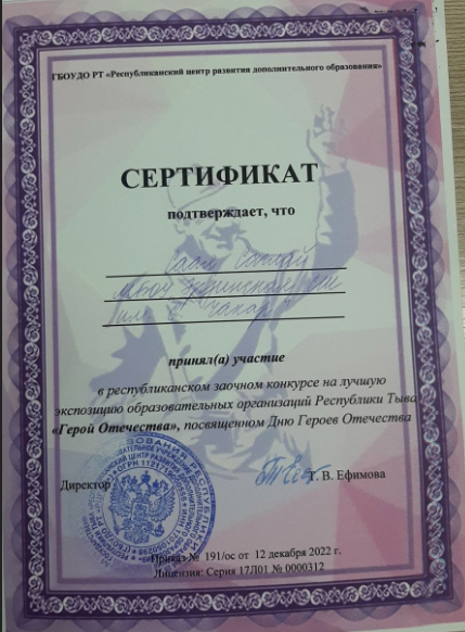 Призер республиканского конкурса музеев «Герой Отечества»! 14.12.2022 / ПОЗДРАВЛЯЕМ НАШУ КОЛЛЕГУ ЧОДУРАА АРТУРОВНУ, НАШИХ УЧЕНИКОВ С ПОБЕДОЙ!