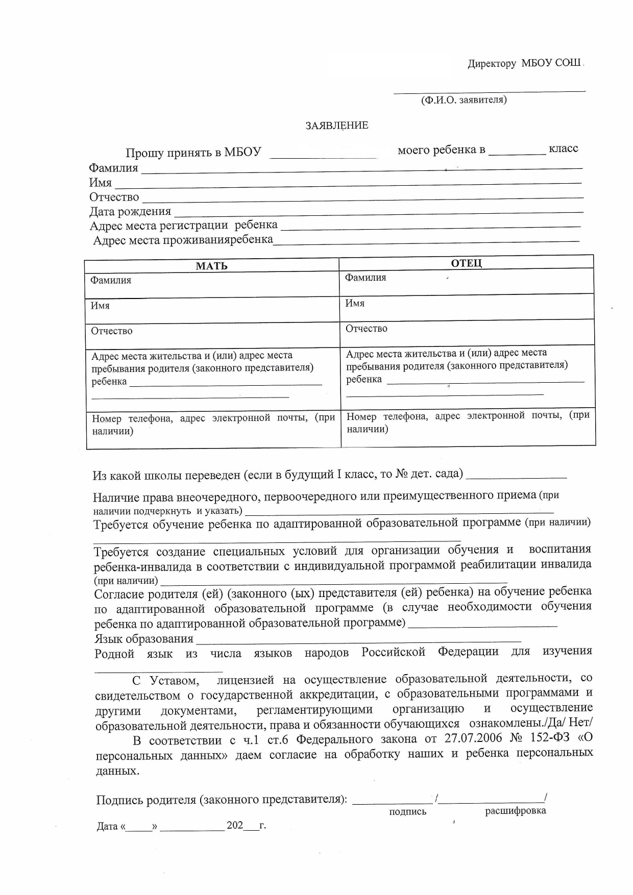 1. Заявление родителей (законных представителей) на имя директора школы.